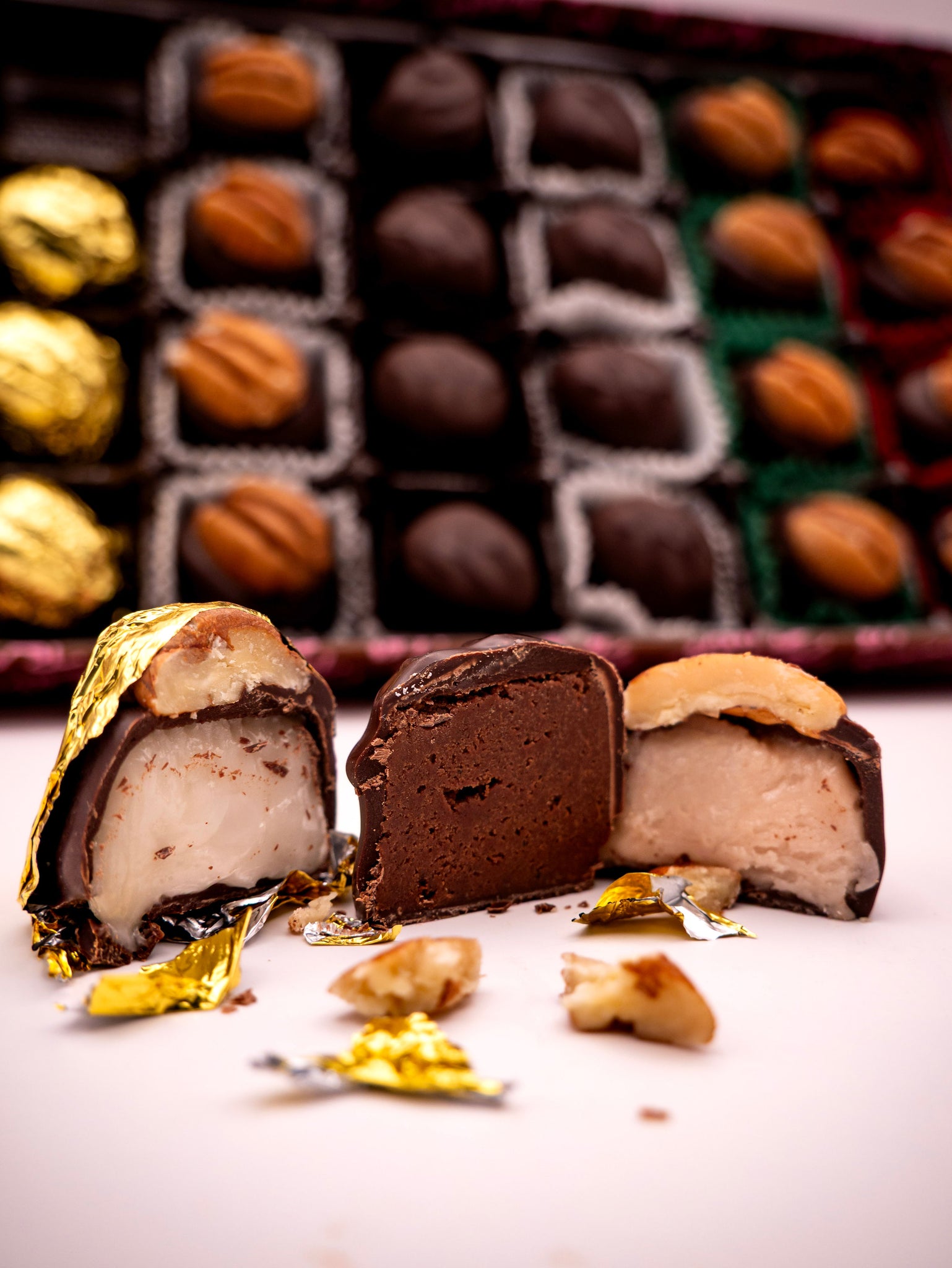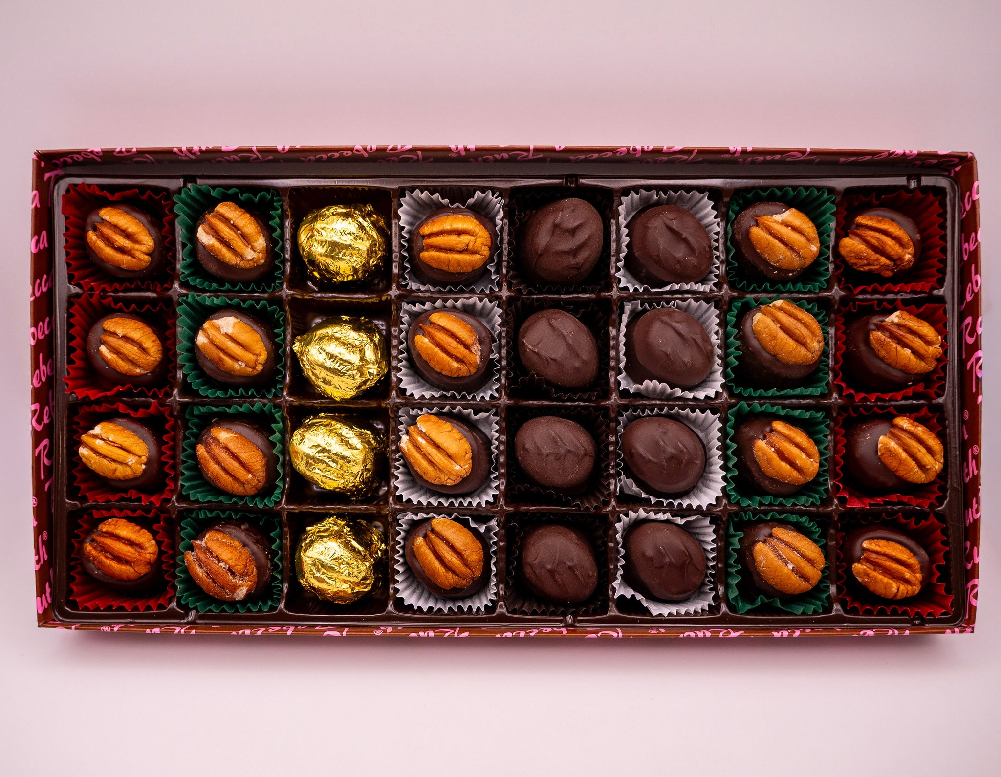 This box contains Bourbon Balls, Rum Balls, Scotch Balls, Cognac Balls, Mint Julep Balls, and Bourbon Coffee Cream Balls, all covered in dark chocolate. A color key is provided in each box!